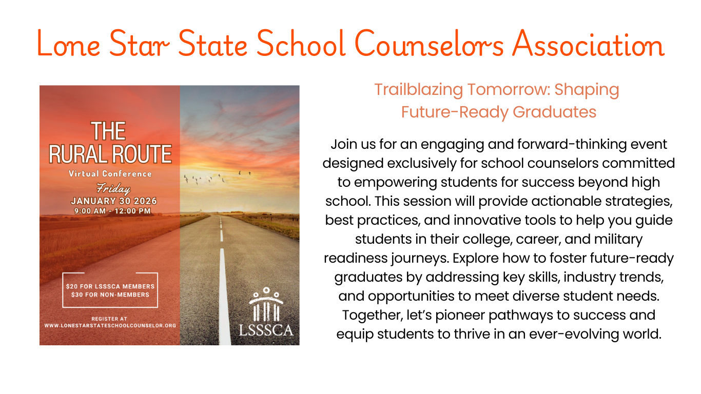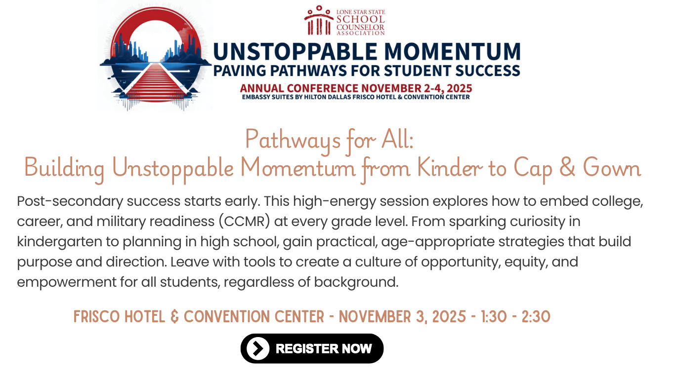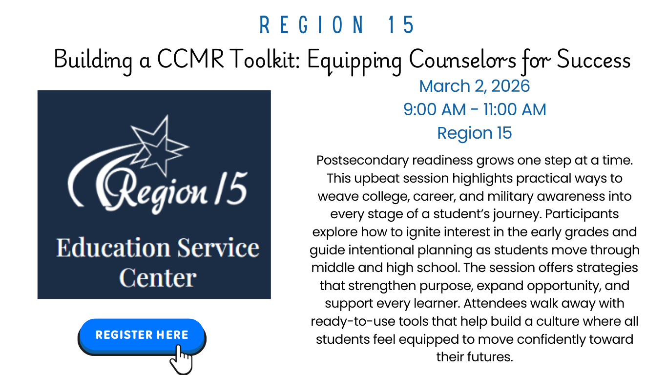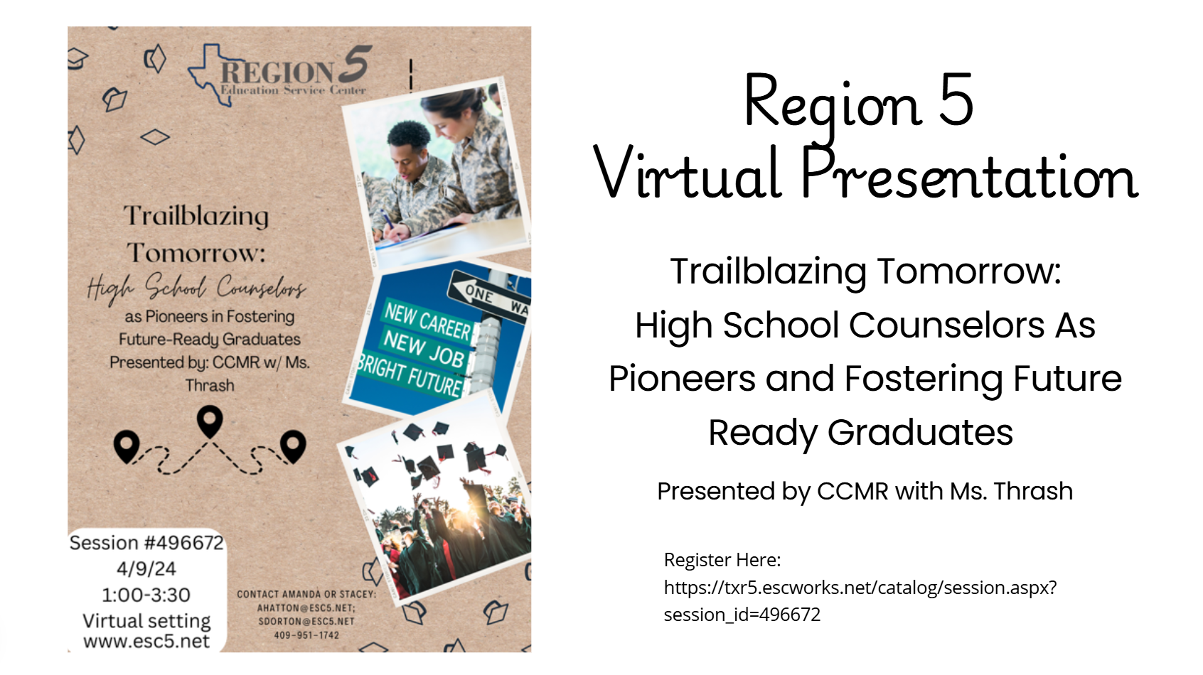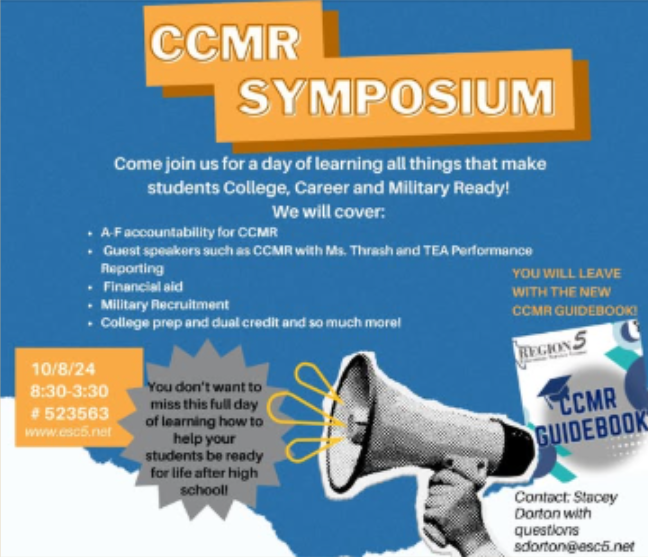 Come join us for a day of learning all things that make students College, Career and Military Ready! We will cover A-F accountability for CCMR as well as have speakers including CCMR with Ms. Thrash! Other topics include financial aid, college prep and dual credit, workforce readiness and so much more! You don’t want to miss this full day of learning how to help your students be ready for life after high school! October 8, 2024 8:30-3:30 Register here: https://txr5.escworks.net/catalog/session.aspx