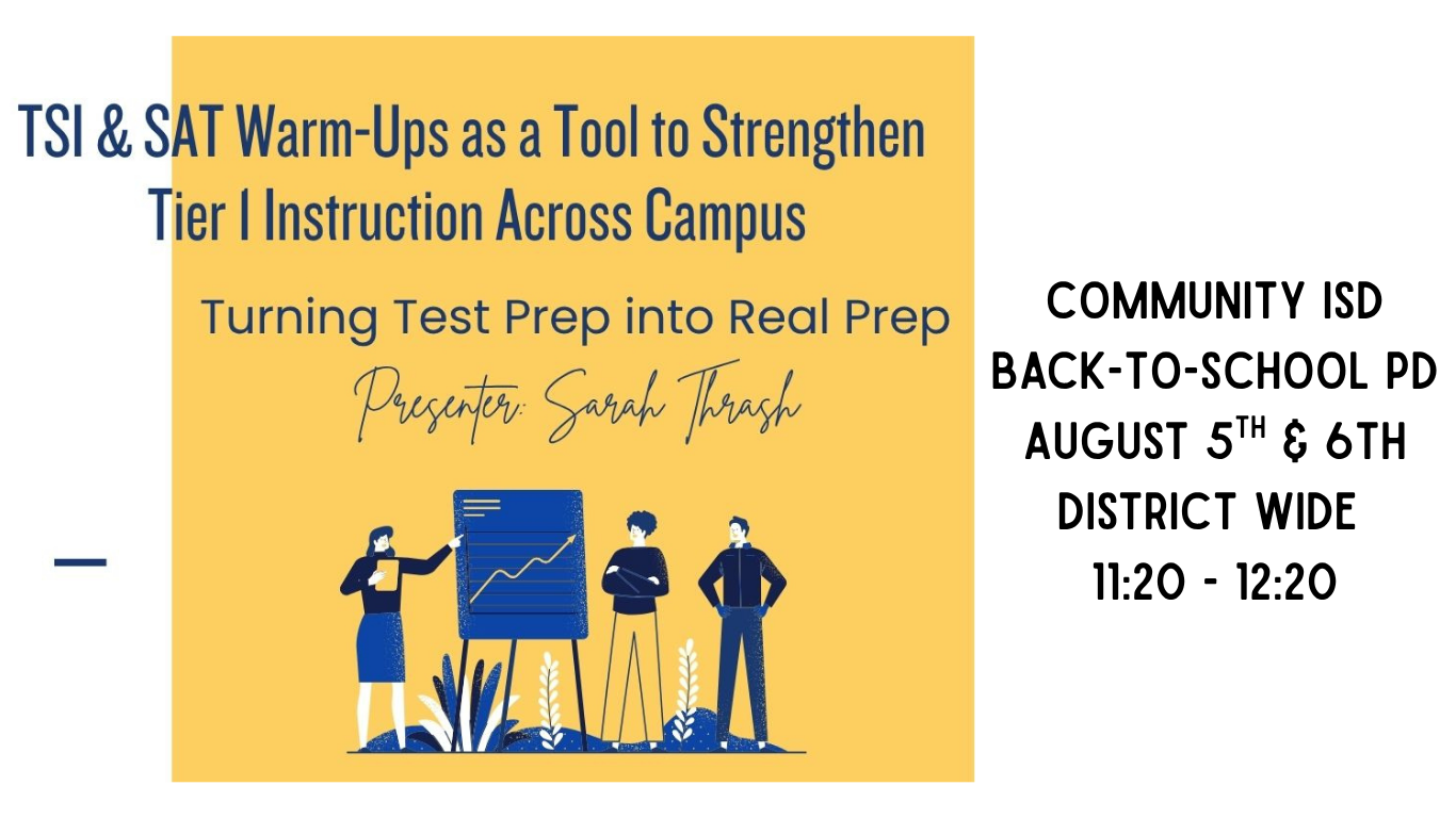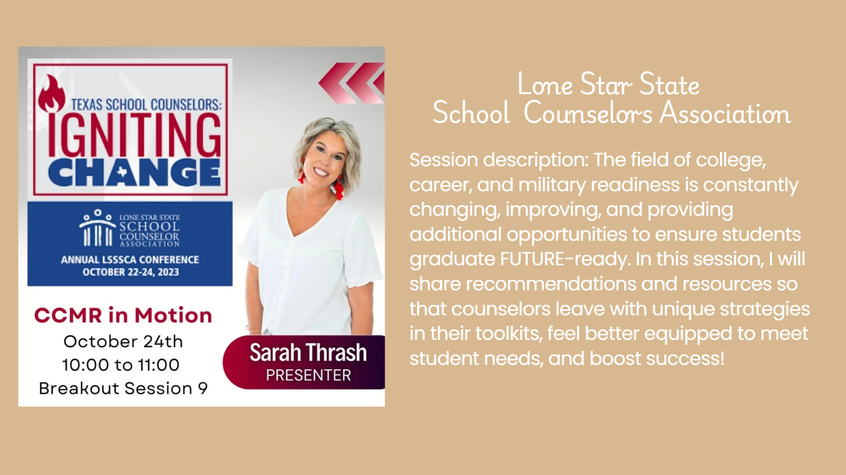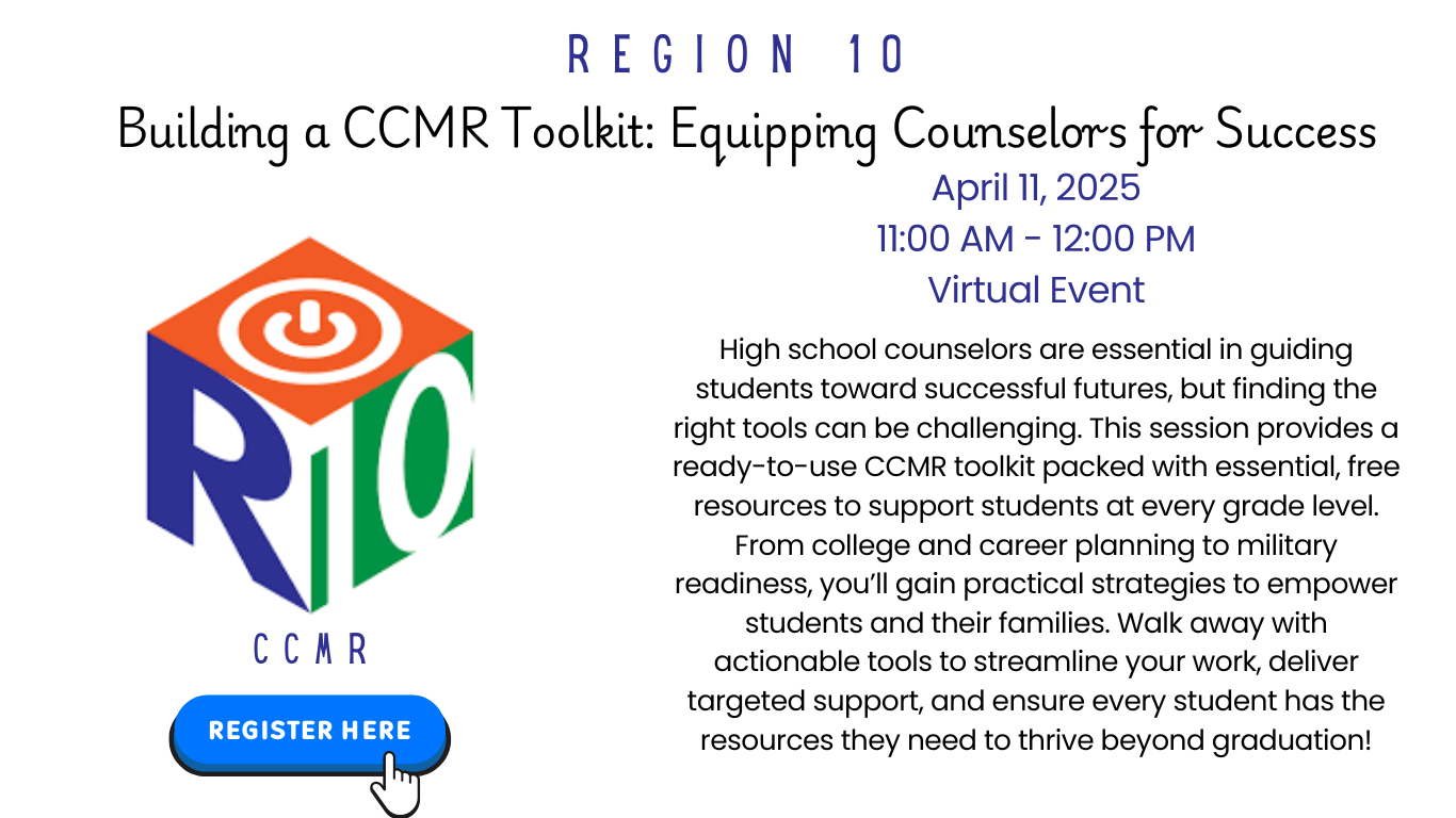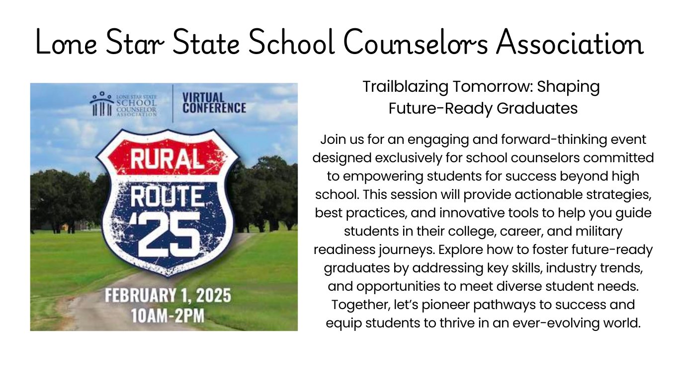 Come join us for a day of learning all things that make students College, Career and Military Ready! We will cover A-F accountability for CCMR as well as have speakers including CCMR with Ms. Thrash! Other topics include financial aid, college prep and dual credit, workforce readiness and so much more! You don’t want to miss this full day of learning how to help your students be ready for life after high school! October 8, 2024 8:30-3:30 Register here: https://txr5.escworks.net/catalog/session.aspx