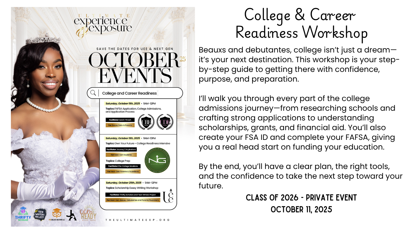 College, Career and Military Readiness: The Road Map with CCMR with Ms. Sarah Thrash LLC Scholarship Essay Writing with Ms. Shunta Spencer This workshop will empower the beaux and debutantes to navigate the complexities of college, career, and military pathways and effective scholarship essay writing with confidence and clarity.